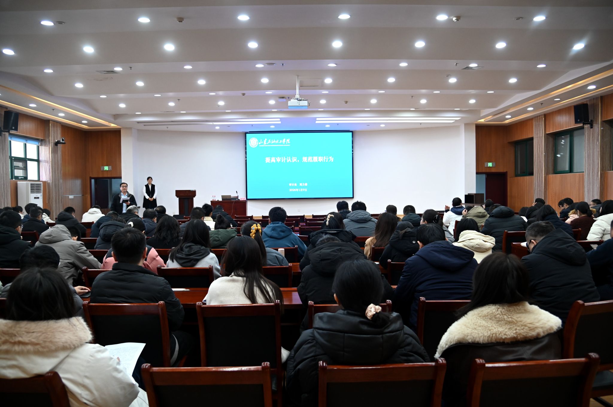 为深入贯彻落实党的二十届四中全会精神,增强干部队伍规范履职意识和风险防控能力,1月9日,学校在学习贯彻党的二十届四中全会精神专题培训班期间,组织开展了“提高审计认识,规范履职行为”专题培训。本次培训由审计处主办,全校未参加上级调训的中层干部、科级干部、专职组织员等150余人参加。